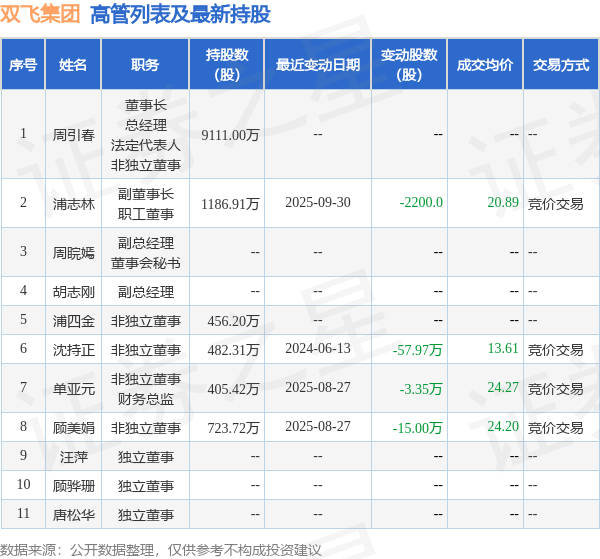 双飞集团的高管列表及最新持股情况如下: