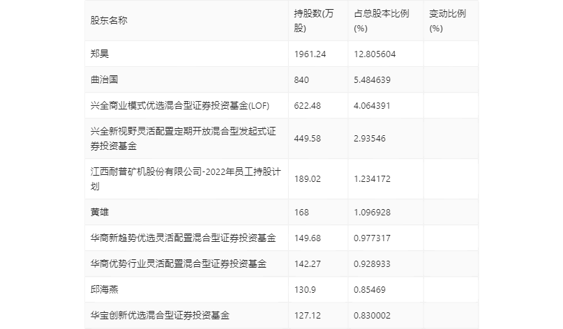 半年报显示,2024年上半年末公司十大流通股东中,新进股东为兴全商业模式优选混合型证券投资基金(LOF)、兴全新视野灵活配置定期开放混合型发起式证券投资基金,取代了一季度末的薏宸价值精选6号私募证券投资基金、华宝可持续发展主题混合型证券投资基金。在具体持股比例上,郑昊、曲治国、江西耐普矿机股份有限公司-2022年员工持股计划、黄雄、华商新趋势优选灵活配置混合型证券投资基金、华商优势行业灵活配置混合型证券投资基金、邱海燕、华宝创新优选混合型证券投资基金持股有所下降。