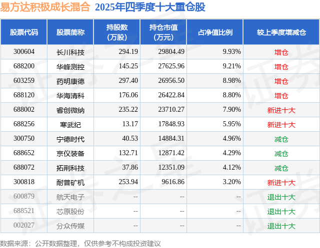 易方达积极成长混合的前十大重仓股如下: