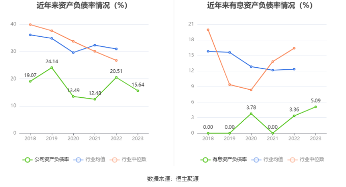 在偿债能力方面,公司2023年年末资产负债率为15.64%,相比上年末下降4.87个百分点;有息资产负债率为5.09%,相比上年末上升1.73个百分点。