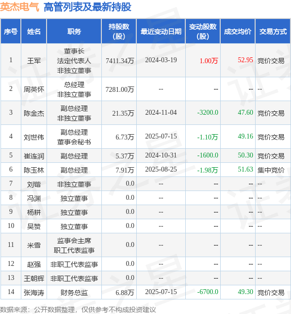 英杰电气近半年内的董监高及核心技术人员增减持详情如下: