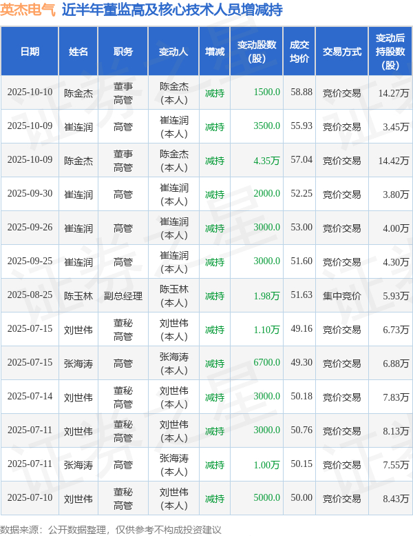 英杰电气近半年内的董监高及核心技术人员增减持详情如下: