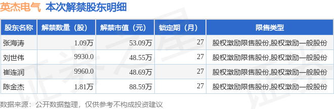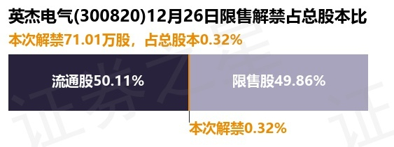 英杰电气(300820)71.01万股限售股将于12月26日解禁,占总股本0.32%