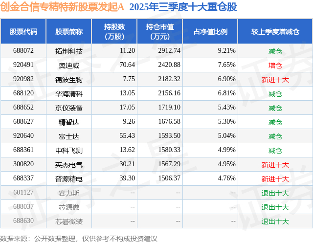 根据2025基金Q3季报公募基金重仓股数据,重仓该股的公募基金共4家,其中持有数量最多的公募基金为创金合信基金的创金合信专精特新股票发起A。创金合信专精特新股票发起A目前规模为1.07亿元,最新净值1.8274(1月6日),较上一交易日上涨1.78%,近一年上涨70.66%。该公募基金现任基金经理为王先伟。王先伟在任的基金产品包括:创金合信积极成长股票A,管理时间为2021年2月26日至今,期间收益率为48.94%;