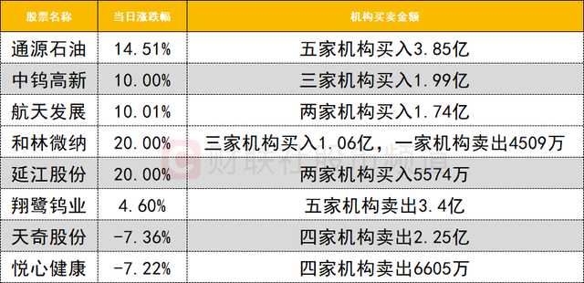 今日龙虎榜机构活跃度较高,通源石油今日冲高回落,获五家机构买入3.85亿。有色·钨概念反复活跃,中钨高新涨停,获三家机构买入1.99亿。而翔鹭钨业遭五家机构卖出3.4亿。