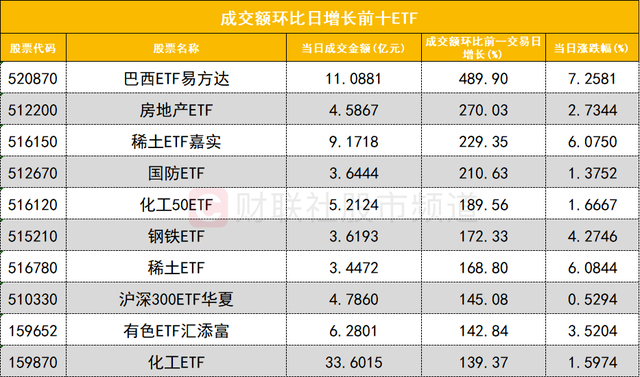 从成交额环比增长前十的ETF来看,巴西ETF易方达(520870)成交额环比增长489%位居首位;房地产ETF(512200)成交额环比增长270%位居次席。