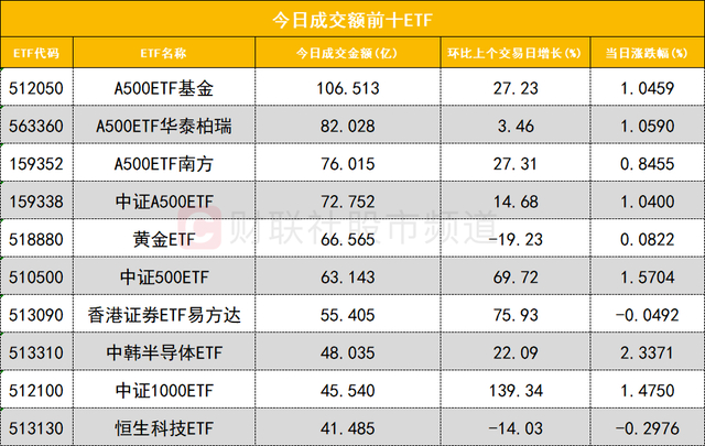 从成交额前十的ETF来看,A500ETF基金(512050)成交额位居首位,A500ETF华泰柏瑞(563360)成交额位居次席。
