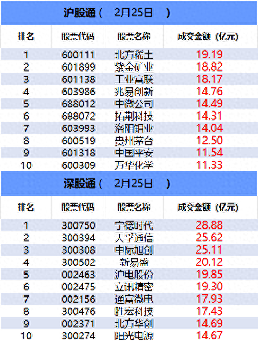 从沪股通前十大成交个股来看,北方稀土位居首位;紫金矿业和工业富联分居二、三位。