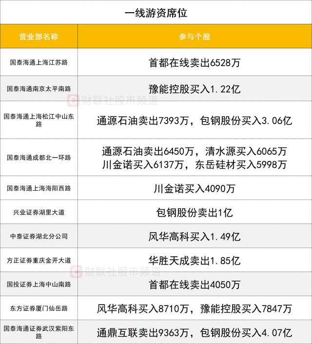 一线游资活跃度较高,通源石油遭两家一线游资(国泰海通证券上海中山东路、国泰海通证券成都北一环路)合计卖出1.38亿。东岳硅材获一家一线游资(国泰海通证券成都北一环路)买入0.59亿。