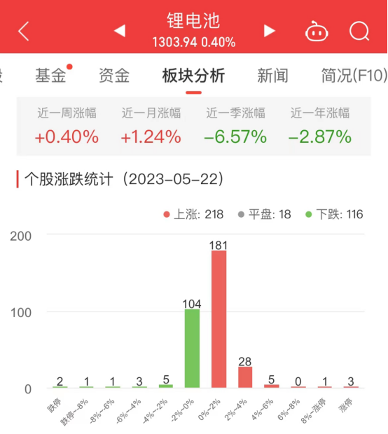 中国经济网北京5月22日讯今日,锂电池板块整体涨幅0.40%,其中218只股票上涨,18只股票平盘,116只股票下跌。