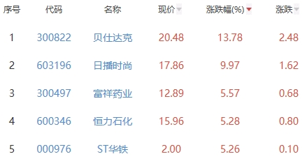 其中,贝仕达克、日播时尚、富祥药业、恒力石化、ST华铁位列板块涨幅前五位,涨幅分别为13.78%、9.97%、5.57%、5.28%、5.26%。