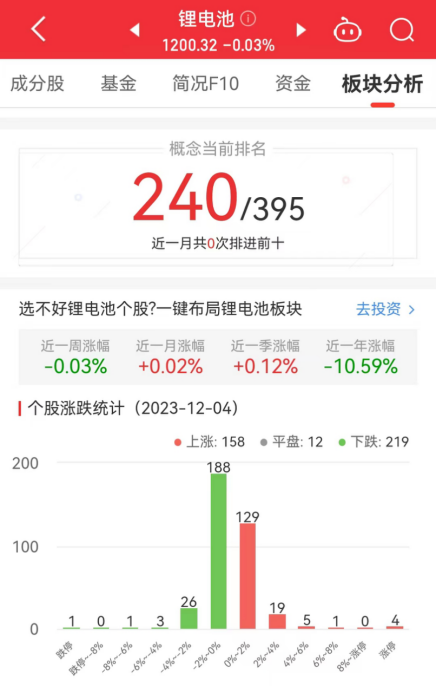 中国经济网北京12月4日讯今日,锂电池板块整体涨幅-0.03%,其中158只股票上涨,12只股票平盘,219只股票下跌。