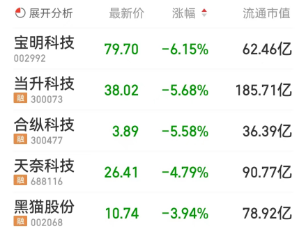 宝明科技、当升科技、合纵科技(维权)、天奈科技、黑猫股份位列涨幅榜后五位,涨幅分别为-6.15%、-5.68%、-5.58%、-4.79%、-3.94%。