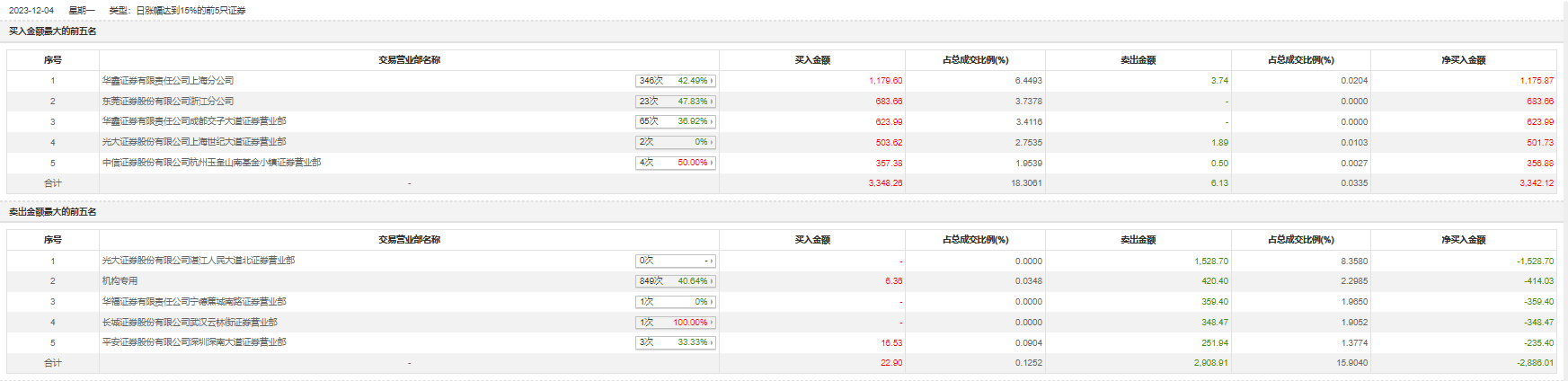 12月4日,贝仕达克今日涨停,全天换手率达4.97%,振幅达19.91%。龙虎榜数据显示,营业部席位合计净买入456.12万元。其中,机构买入6.36万元,卖出420.4万元,合计净卖出414.03万元。此外,华鑫证券上海分公司、东莞证券浙江分公司分别买入1179.60万元、683.66万元;光大证券湛江人民大道北证券营业部、华福证券宁德蕉城南路证券营业部分别卖出1528.70万元、359.40万元。