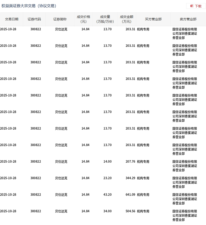 10月28日,贝仕达克大宗交易成交224万股,成交额3324.18万元,占当日总成交额的45.54%,成交价14.84元,较市场收盘价17.1元折价13.22%。