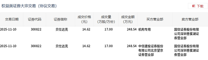 11月10日,贝仕达克大宗交易成交34万股,成交额497.08万元,占当日总成交额的11.86%,成交价14.62元,较市场收盘价16.92元折价13.59%。