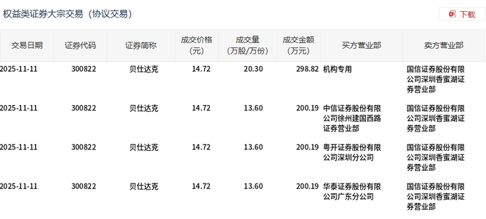 11月11日,贝仕达克大宗交易成交61.1万股,成交额899.39万元,占当日总成交额的6.62%,成交价14.72元,较市场收盘价17.29元折价14.86%。