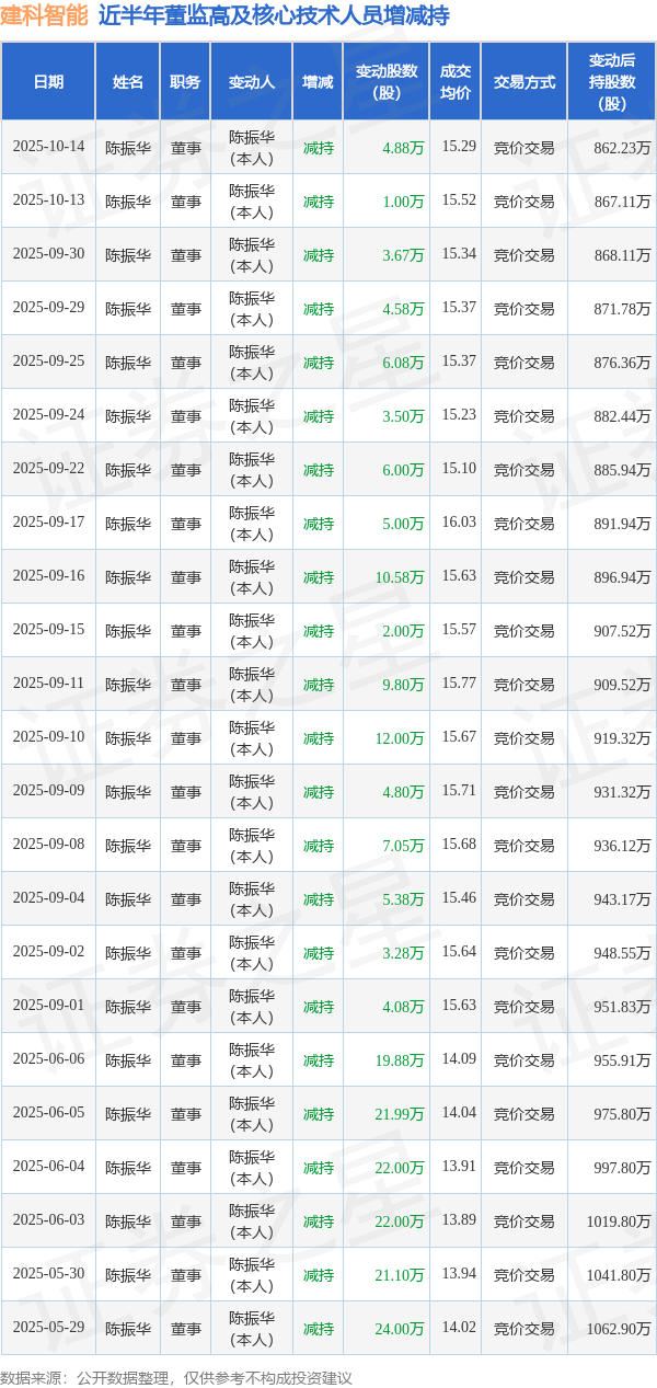 建科智能近半年内的董监高及核心技术人员增减持详情如下:
