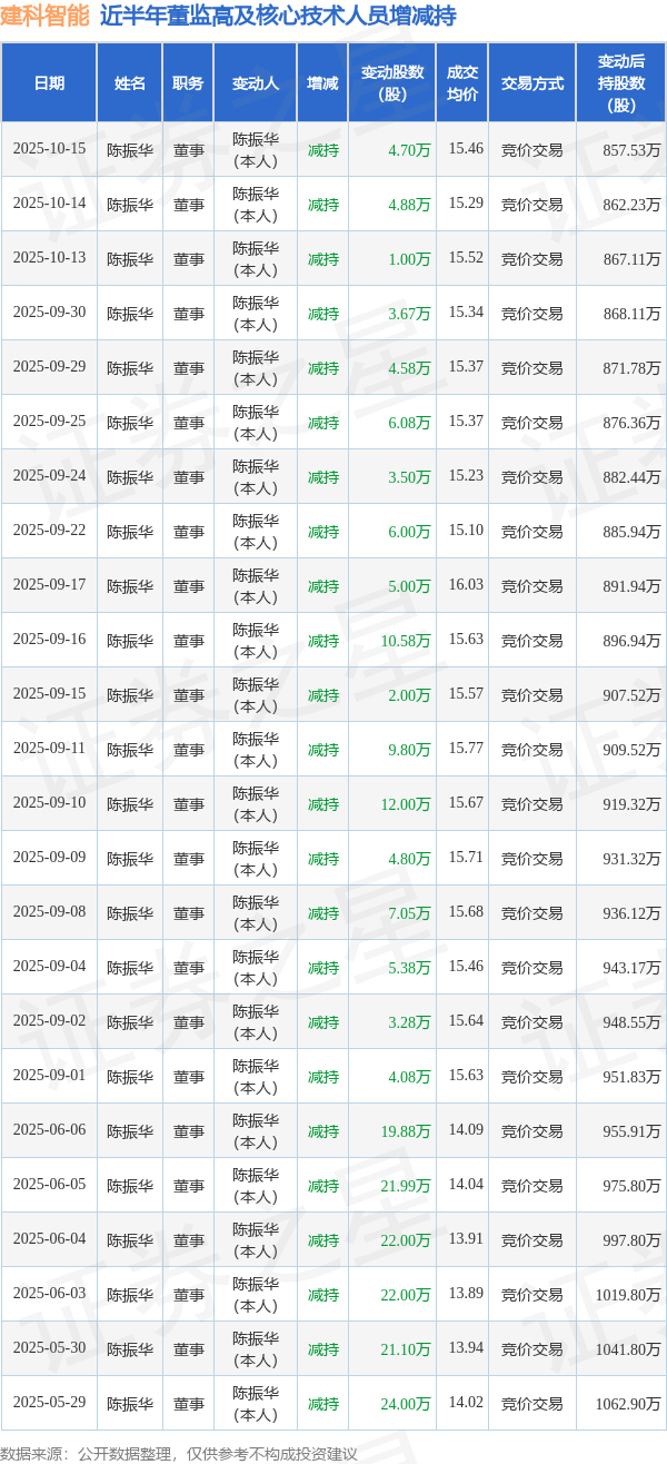 建科智能近半年内的董监高及核心技术人员增减持详情如下: