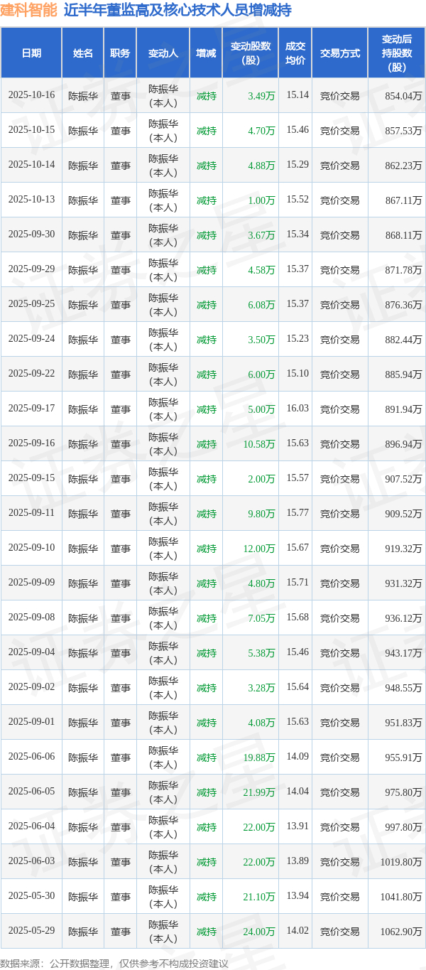 建科智能近半年内的董监高及核心技术人员增减持详情如下: