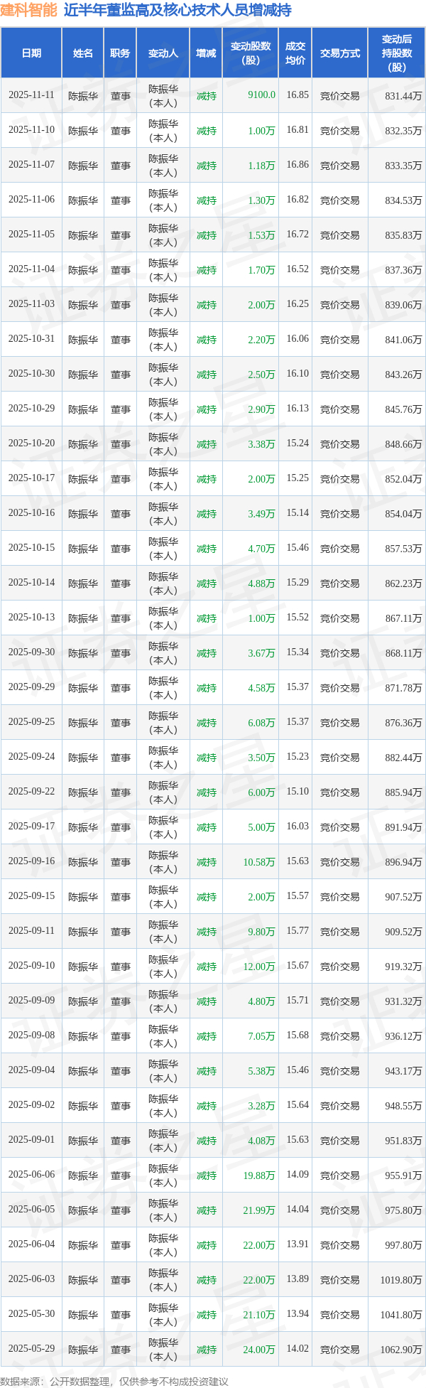 建科智能:11月11日高管陈振华减持股份合计9100股