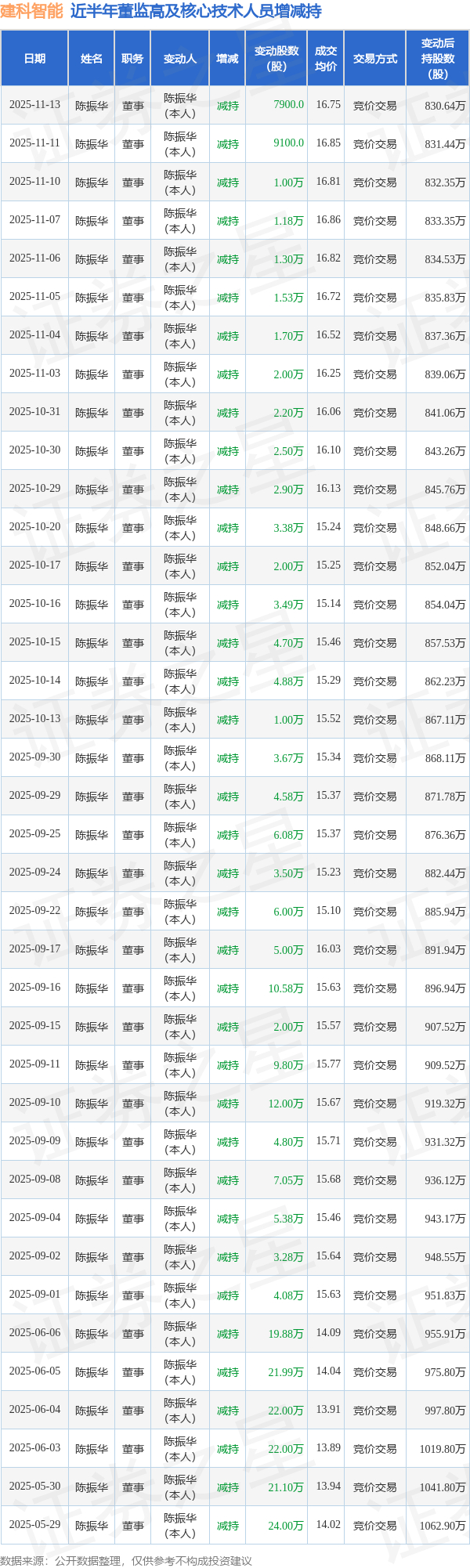 建科智能近半年内的董监高及核心技术人员增减持详情如下: