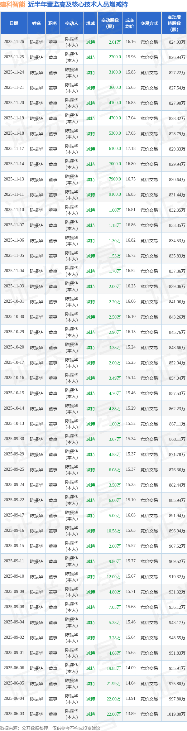 建科智能近半年内的董监高及核心技术人员增减持详情如下: