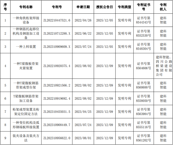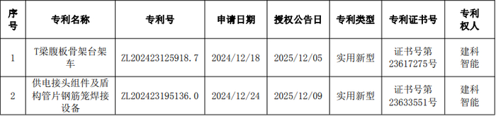建科智能:共获12项专利证书