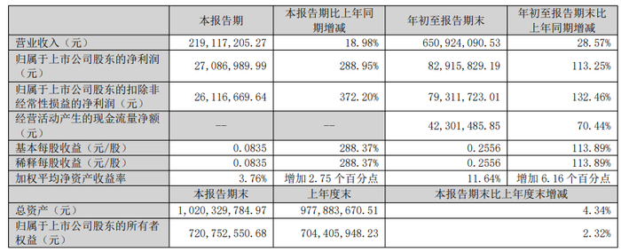 其中第三季度,北鼎股份业收入为2.19亿元,同比增长18.98%;归母净利润为2708.70万元,同比增长288.95%;扣非归母净利润为2611.67万元,同比增长372.20%;基本每股收益0.08元。