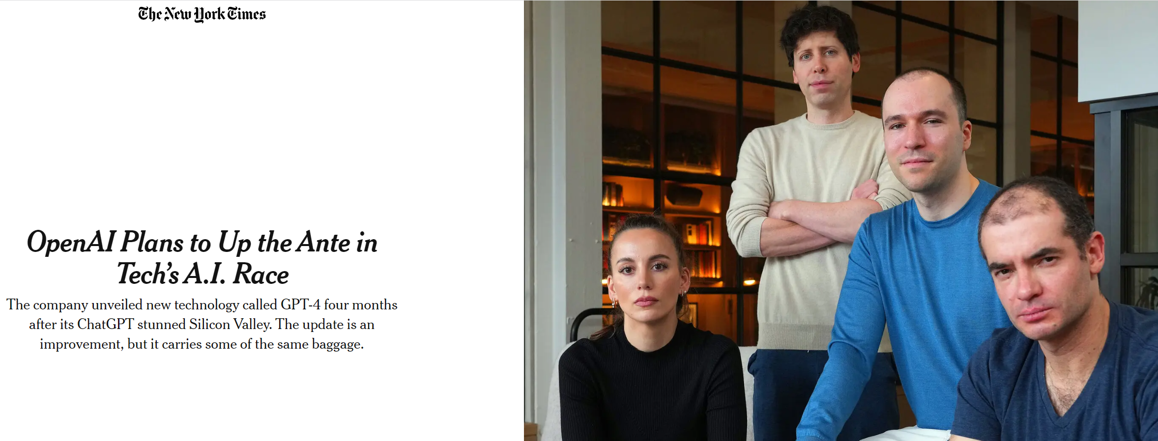 右起分别是伊尔亚·苏茨克维(Ilya Sutskever)、格雷格·布洛克曼 (Greg Brockman)、山姆·阿尔特曼(Sam Altman)和米拉·穆拉蒂(Mira Murati)。图片来源:《纽约时报》截图