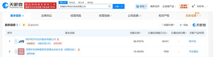 雷达财经讯,天眼查工商信息显示,近日,芜湖阿尔特动力科技有限公司成立,法定代表人为傅彬,注册资本约6.7亿人民币,经营范围为汽车零部件及配件制造、汽车零部件研发、汽车零配件零售、汽车零配件批发、货物进出口、技术进出口、国内贸易代理等。股东信息显示,该公司由阿尔特(300825)、芜湖华安战新股权投资基金合伙企业(有限合伙)共同持股。