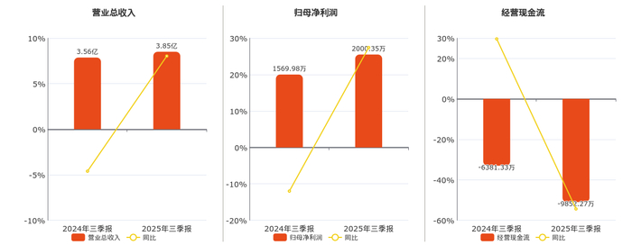 公司营业总收入为3.85亿元。归母净利润为2000.35万元。经营活动现金净流入为-9852.27万元,较去年同报告期经营活动现金净流入减少3470.95万元。