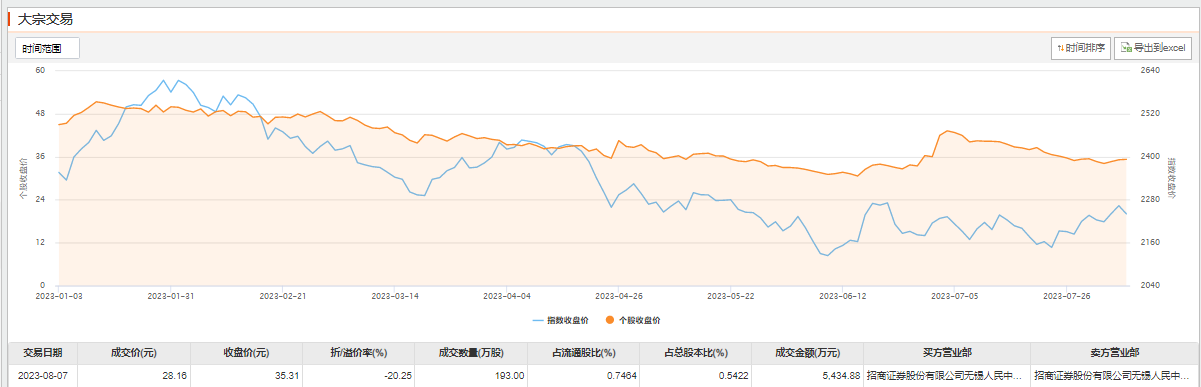 8月7日大宗交易成交193万股,成交额5434.88万元,占当日总成交额的17.2%,成交价28.16元,较市场收盘价35.31元折价20.25%。