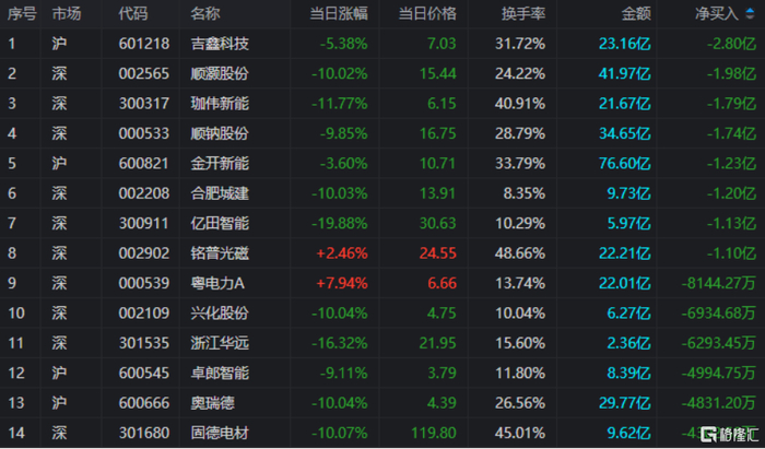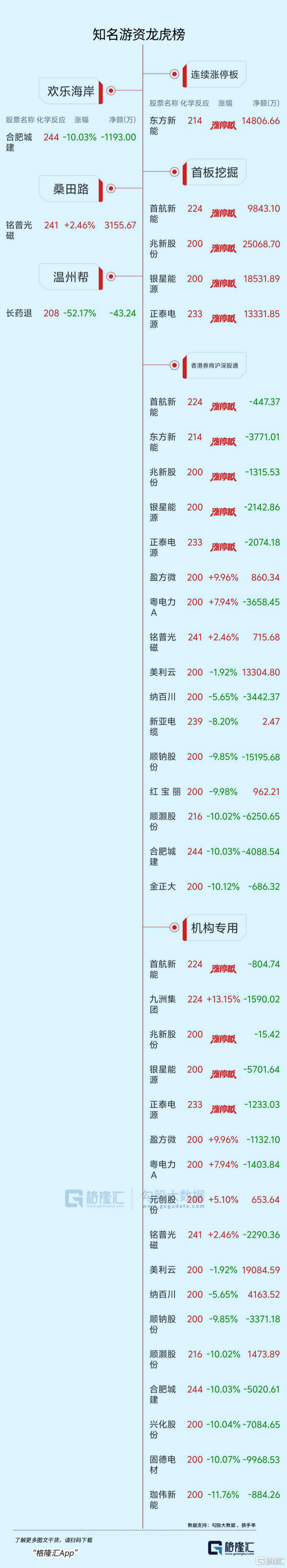 龙虎榜单日净卖出额前三为吉鑫科技、顺灏股份、珈伟新能,分别为2.8亿、1.98亿、1.79亿。