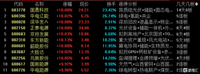 国晟科技14天6板,华电辽能、深华发A5连板,正泰电源8天4板,京投发展6天4板,东方新能5天3板,韶能股份、大胜达3连板,兆新股份4天2板,国新能源、华电能源2连板。