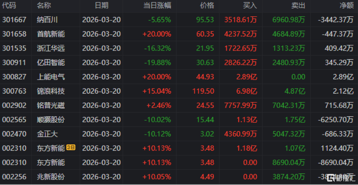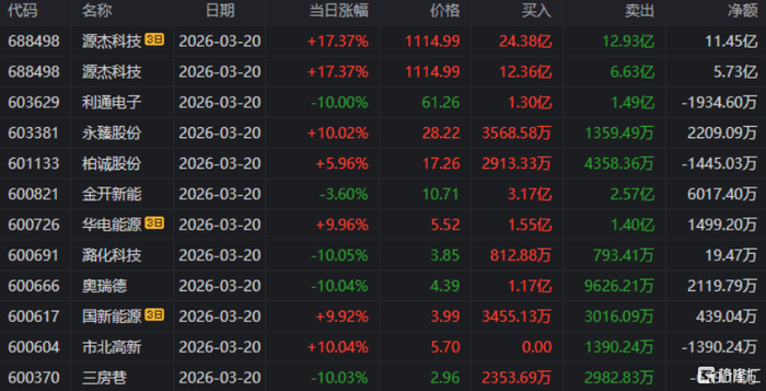 龙虎榜中涉及机构专用席位的个股中,单日净卖出额前三为源杰科技、上能电气、银星能源,分别为9005.01万、6343.39万、5701.64万。