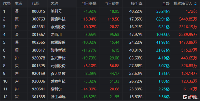 龙虎榜中涉及机构专用席位的个股中,单日净买入额前三为美利云、锦浪科技、永臻股份,分别为1.72亿、5449.85万、3316.19万。