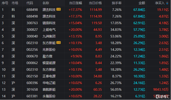 龙虎榜单日净买入额前三为源杰科技、锦浪科技、上能电气,分别为4.87亿、4.18亿、3.78亿。