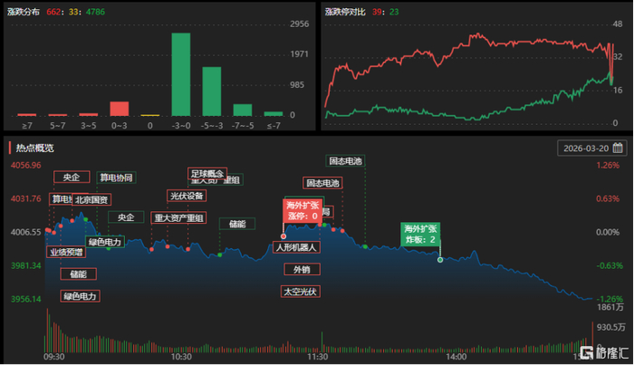 3月20日,沪指跌1.24%报3957点,深证成指跌0.25%,创业板指涨1.3%。
