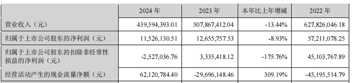 2024年,公司实现营业总收入4.40亿元,同比下降13.44%;归属于上市公司股东的净利润1152.61万元,同比下降8.93%;归属于上市公司股东的扣除非经常性损益的净利润-252.70万元,上年同期333.54万元;经营活动产生的现金流量净额为6212.08万元,上年同期为-2969.61万元。