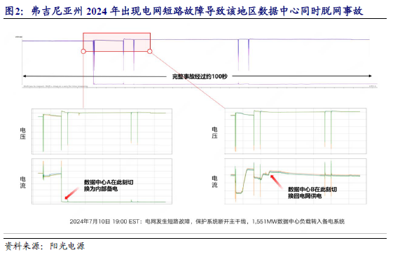 以北美弗吉尼亚州为例:2024年7月,一次电网短路故障导致该地区数十家数据中心共计1551MW负载同时脱网,电网因瞬间失去巨量负载而功率严重过剩,引发危险的暂态过电压与频率飙升。类似事故在2025年2月再度上演。