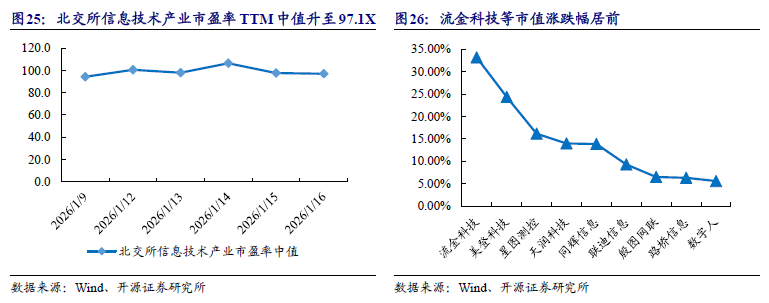本周,从估值表现看,北交所信息技术产业市盈率TTM中值升至97.1X。从本周个股市值表现来看,流金科技+33.20%、美登科技+24.38%、星图测控+16.15%分列市值涨跌幅前三甲。(信息技术公司类别:包含集成电路、高端软件、智能终端、高端服务器、网络和通信、云计算等细分行业。)