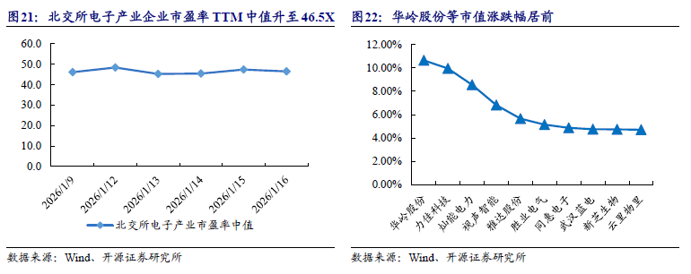 本周,从估值表现看,北交所电子产业市盈率TTM中值升至46.5X。从本周个股市值表现来看,华岭股份+10.65%、力佳科技+9.96%、灿能电力+8.55%分列市值涨跌幅前三甲。(电子公司类别:包含消费电子、医疗电子、新能源电子设备、仪器仪表等细分行业)