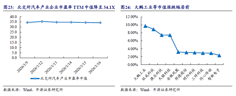 本周,从估值表现看,北交所汽车产业市盈率TTM中值降至34.1X。从本周个股市值表现来看,大鹏工业+9.73%、旺成科技+8.90%、捷众科技+7.44%分列市值涨跌幅前三甲。(汽车公司类别:包含汽车硬件、汽车电子、汽车整车制造、汽车材料、内外饰设计、后市场服务等细分行业)