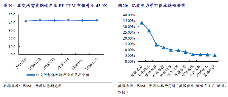 本周,从估值表现看,北交所智能制造产业市盈率TTM中值升至43.0X。从本周个股市值表现来看,亿能电力+33.47%、七丰精工+26.67%、铁拓机械+14.49%分列市值涨跌幅前三甲。(智能制造公司类别:包含机械设备、机械零件制造、军工制造、交运设备、电气设备等细分行业)
