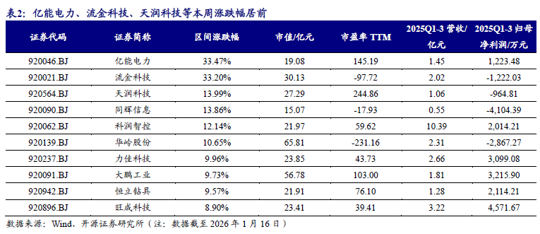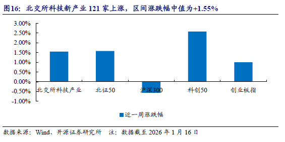 从周度涨跌幅数据来看,2026年1月12日至2026年1月16日,北交所科技新产业159家企业中121家上涨,区间涨跌幅中值为+1.55%,亿能电力+33.47%,流金科技+33.20%,天润科技+13.99%,同辉信息+13.86%,科润智控+12.14%位列涨幅前五。北证50、沪深300、科创50、创业板指周度涨跌幅分别为+1.58%、-0.57%、+2.58%、+1.00%。