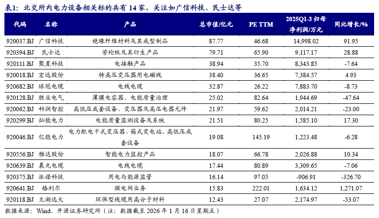 面对指数级增长的算力需求与老化缓慢的公共电网之间日益尖锐的矛盾,以OpenAI、xAI、谷歌为代表的头部AI实验室,正集体选择绕开公共电网,在数据中心园区内自建燃气发电厂。北交所内电力设备相关标的共有14家,截至2026年1月16日总市值达到445.17亿元,包括广信科技、民士达、聚星科技、宏远股份、球冠电缆、胜业电气、科润智控、灿能电力、亿能电力、雅达股份、晨光电缆、派诺科技、格利尔、太湖远大。关注如广信科技、民士达等稀缺性标的。广信科技(920037.BJ)是绝缘纤维材料及其成型制品的专业供应商,为国内少数具备750kV及以上超/特高压等级绝缘纤维材料产品生产能力的企业之一。民士达(920394.BJ)为国内第一家芳纶纸自主制造商,截至2023年4月,民士达芳纶纸产品的全球市场占有率居于第二位,仅次于美国杜邦公司,已成为“国家级制造业单项冠军示范企业”、国家级专精特新“小巨人”企业。