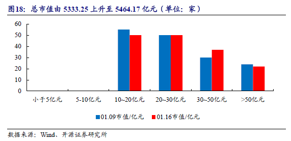 2026年1月12日至2026年1月16日,159家企业的市值整体上升,总市值由5333.25上升至5464.17亿元,市值中值由23.94上升至24.39亿元。