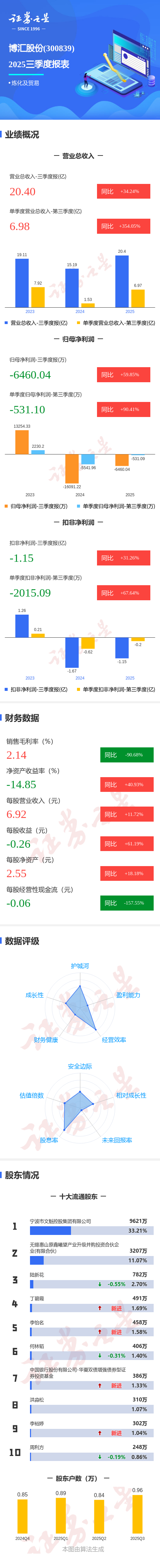 证券之星消息,博汇股份2025年三季报显示,公司主营收入20.4亿元,同比上升34.24%;归母净利润-6460.04万元,同比上升59.85%;扣非净利润-1.15亿元,同比上升31.26%;其中2025年第三季度,公司单季度主营收入6.98亿元,同比上升354.05%;单季度归母净利润-531.1万元,同比上升90.42%;单季度扣非净利润-2015.09万元,同比上升67.64%;负债率56.84%,投资收益4350.5万元,财务费用3695.32万元,毛利率2.14%。