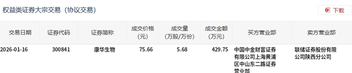 康华生物今日大宗交易平价成交5.68万股,成交额429.75万元
